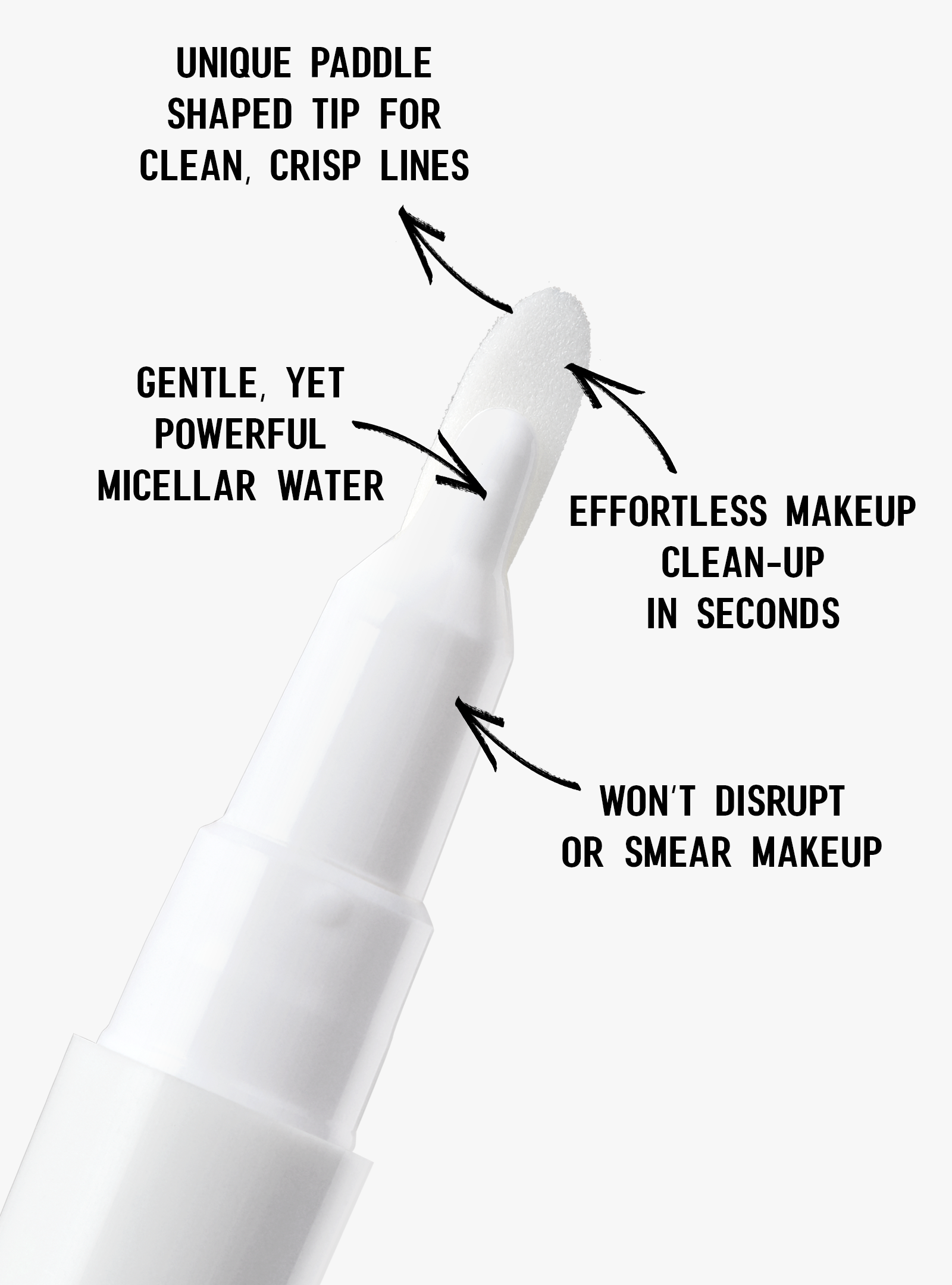The days of licking cotton swabs and messy makeup remover wipes are over. Perfect your wings, lip liner, graphic eye looks or anything in between with FLIK ERASER. Featuring our iconic paddle tip for the most precise corrections, FLIK ERASER's micellar formula removes even waterproof imperfections without smearing makeup.
