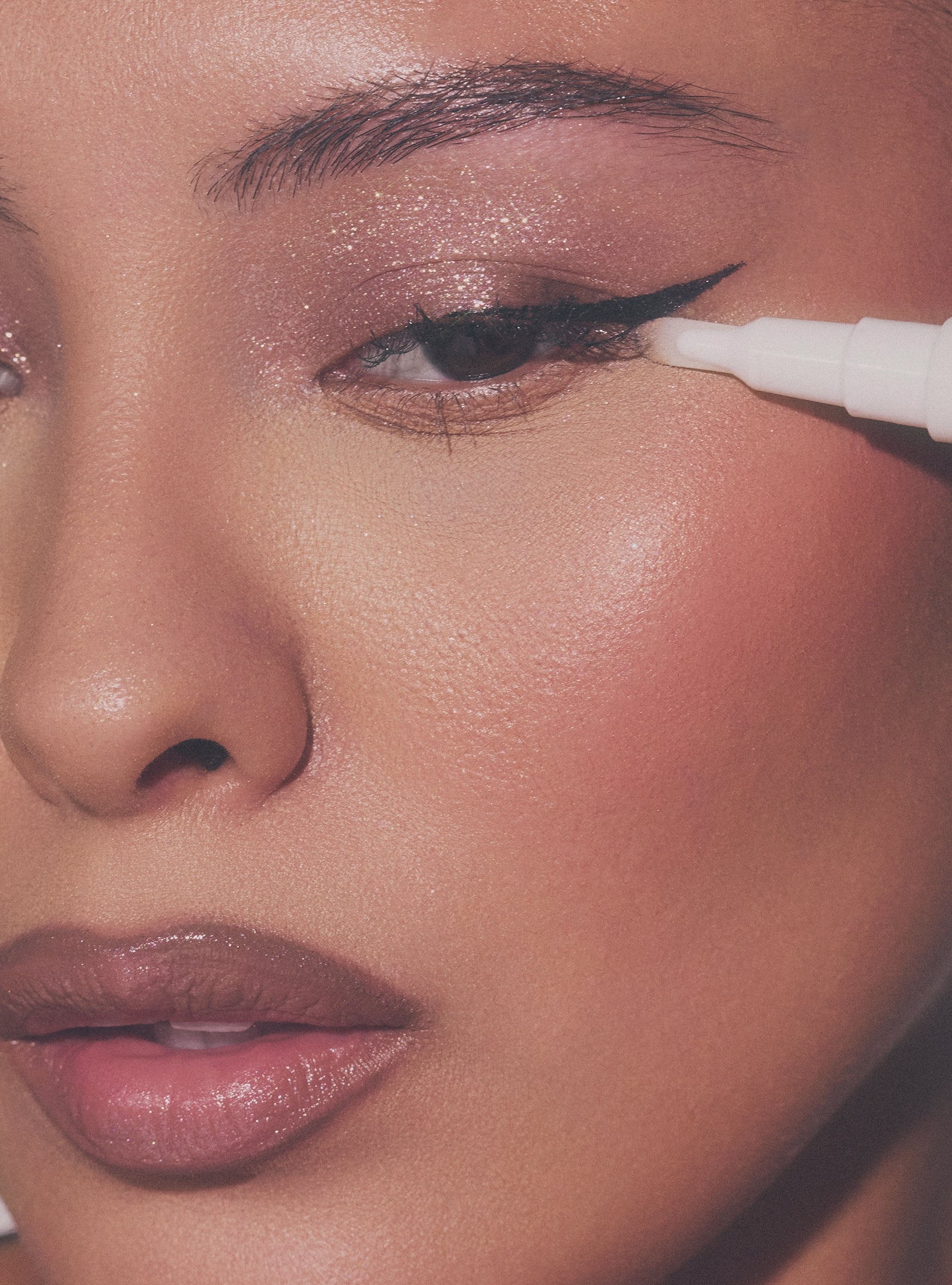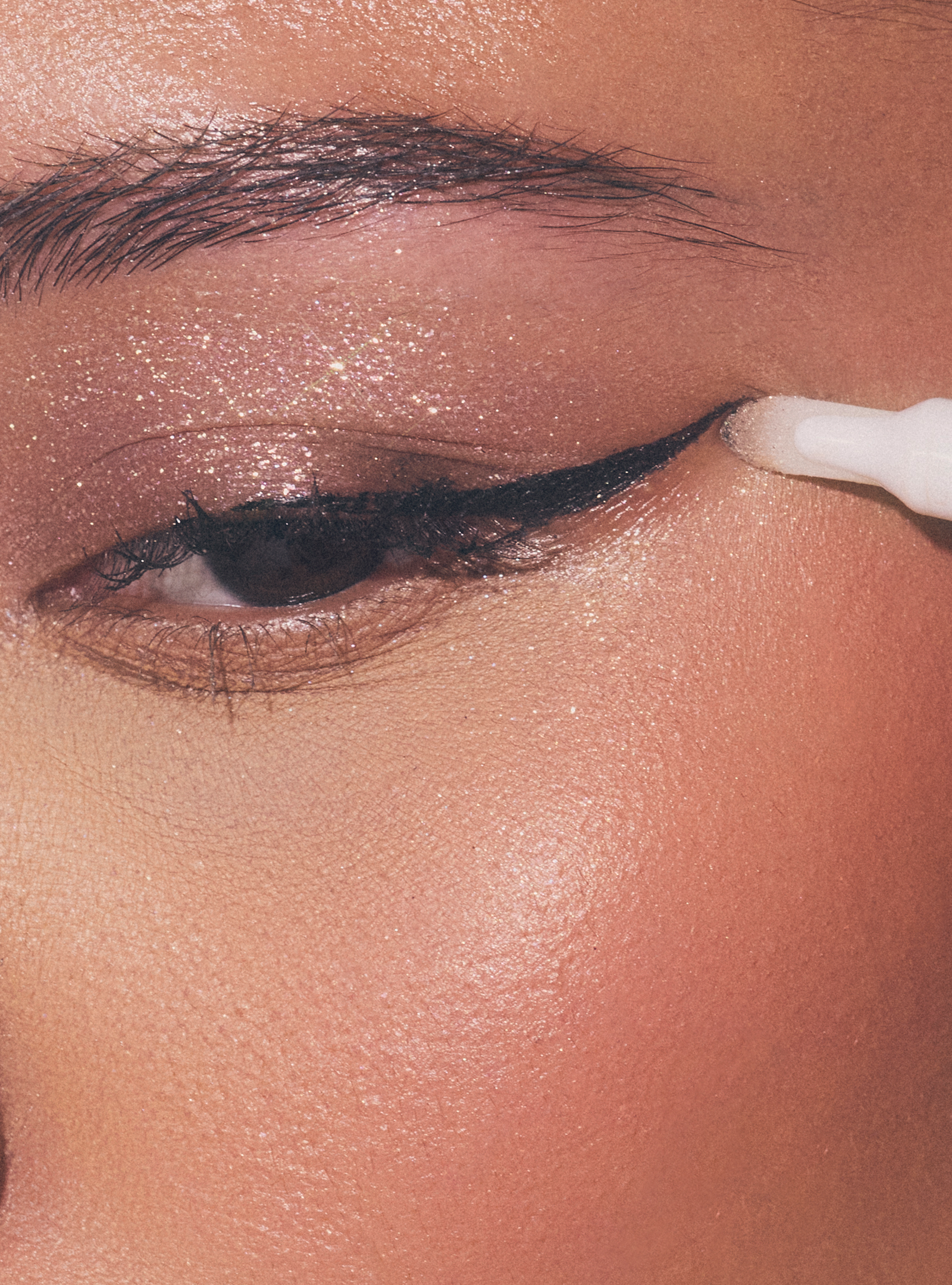 Swipe FLIK ERASER along the edges of any area you want to clean up for a shaper look –– like eyeliner, eye paint, eyeshadow, or lip liner. Use the thin edge of the paddle tip for ultra-crisp lines and the flat edge of the tip to clean up larger areas or graphic looks.
