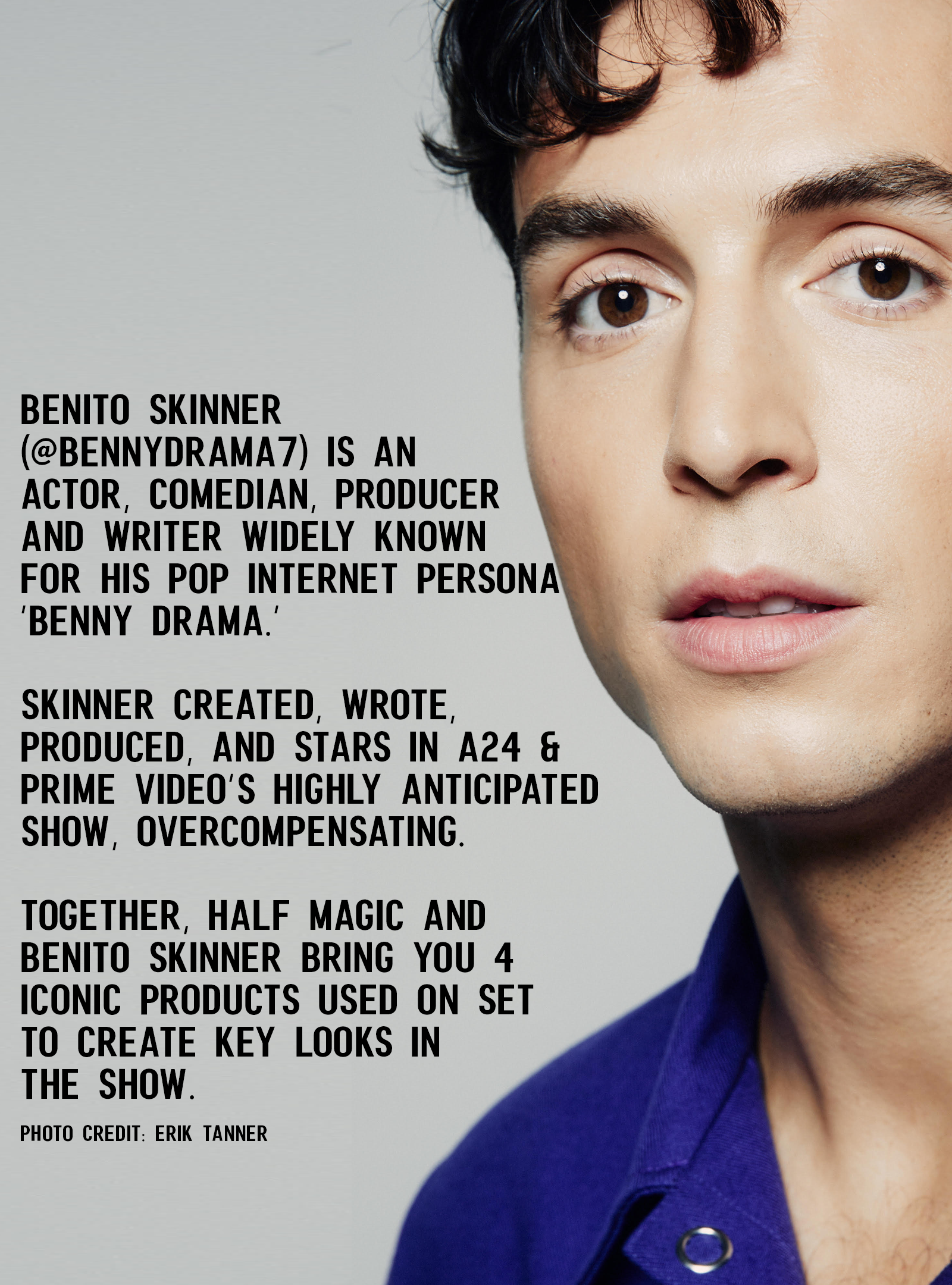 A24 & Prime Video’s highly anticipated TV show, OVERCOMPENSATING, is a college-set comedy series telling the story of a young football player who is navigating his true self. Benito Skinner, known for his pop internet persona ‘Benny Drama,’ created, wrote, produced, and stars in the show.